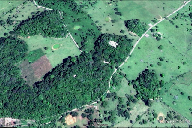Google Earth にはプラン・デ・アユトゥラ村を通り越した先 (赤い✕印) に遺跡の写真が何枚も張り付けてあるのですが、