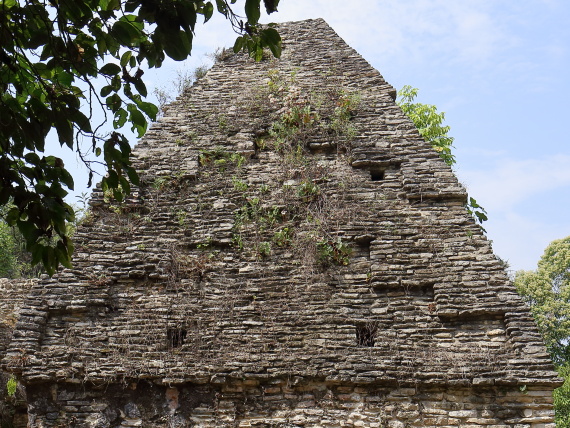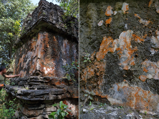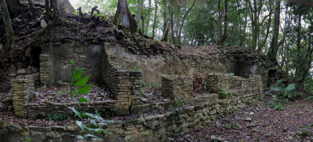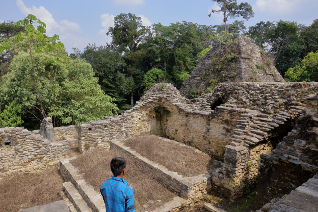 崩れた屋根の左側からは階段状のマヤアーチの室内が覗け(写真下左)、右側からは独立した屋根を持つ内部神殿が見えました