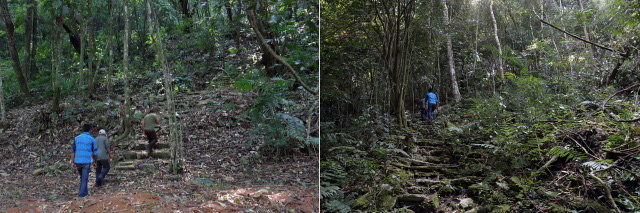 斜面に付けられた階段を登っていきます。 頂上に近づくと木々の間から建物の頭が見えてきて、写真左中央は建造物 2 の上部、