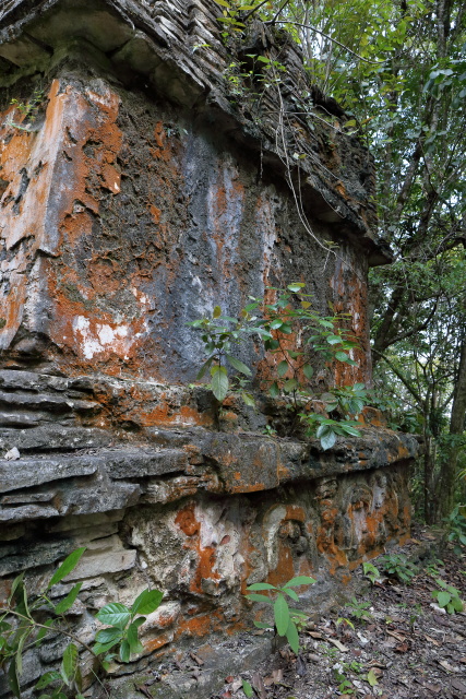 三層目の基壇に上がり南側から見た建物の裏側 (南西側) で、低層の基壇には漆喰成型した彫刻が残っています。 建物裏の通路は狭く