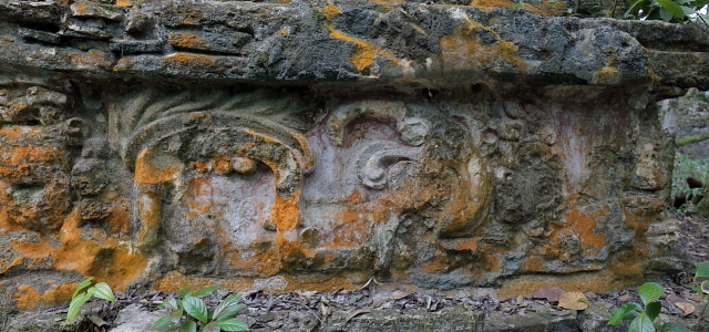 碑文は部分的で充分な解読には至っていませんが、古典期前期の古い書体で書かれており、375年の王による建物の奉納文がが書かれていた