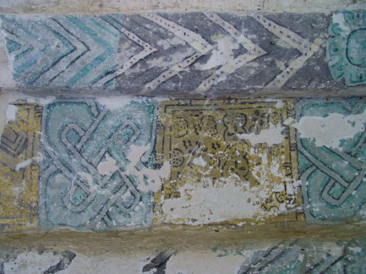 入口上の鴨居に残る彩色ですが、上塗りが重ねられた為、同じ層の壁画でないと図像が読み取れません。