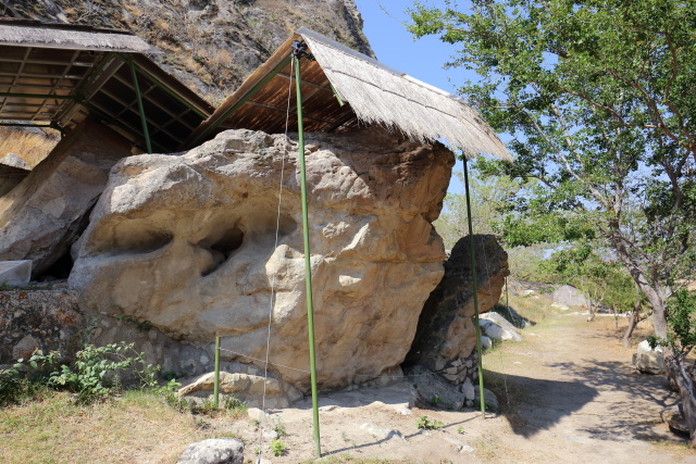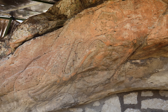 屋根の下には長さ 1m 強の巨石があり、図柄は彫り込まれていませんが、表面を綺麗に削り取ってあります。 儀礼に用いられたものか、或いは