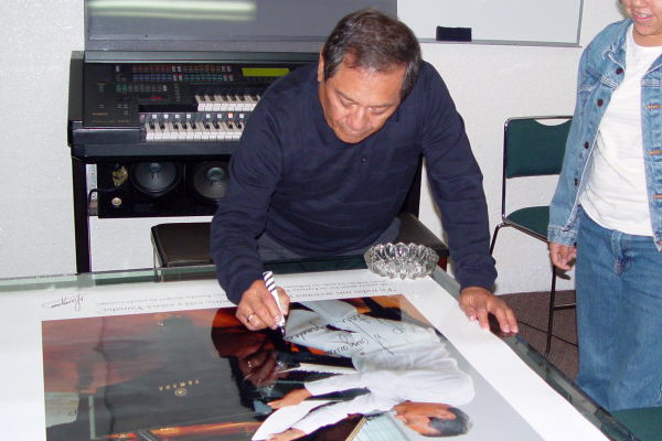 大の日本ファンのマンサネロ氏、使用する楽器も日本製を愛用し、グランドピアノのポスターにも登場です。