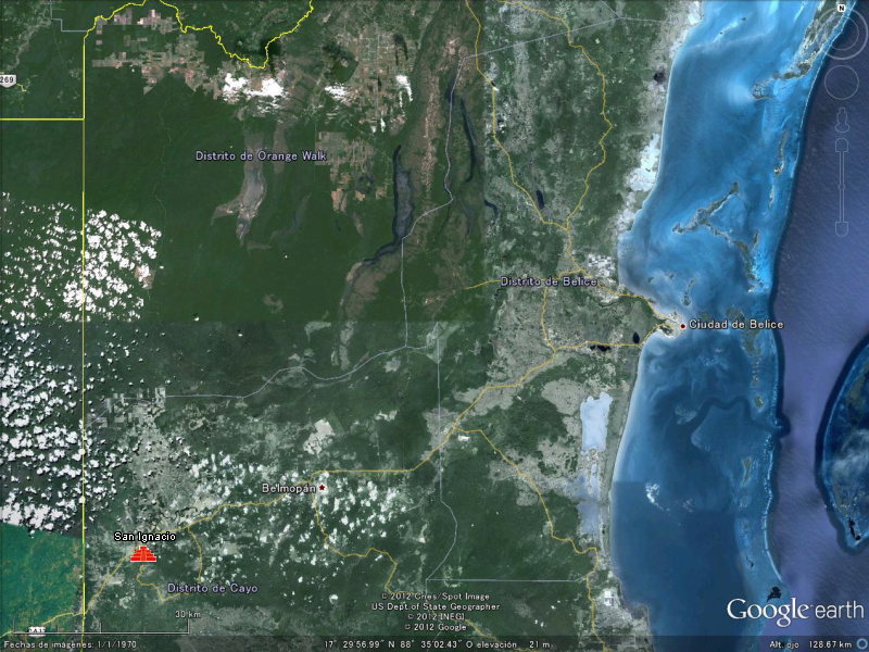 マカル川に架かる鉄橋を渡るとサン・イグナシオの町。 直ぐにカハル・ペチの看板が見えてきます。 道はグアテマラ国境に向かう