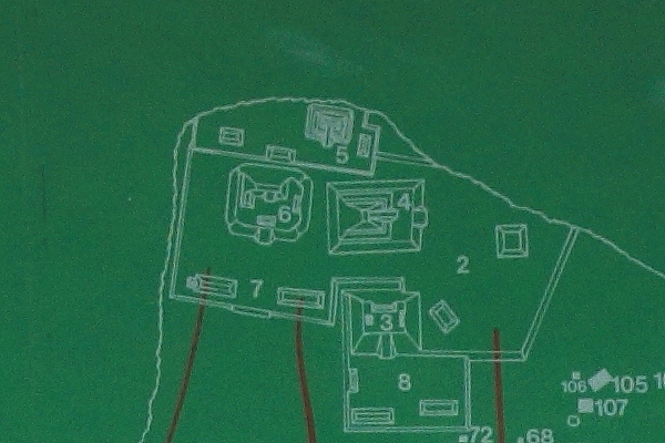 左はビジターセンターにあった建造物4 の平面図で下部基壇と上部神殿の関係がわかります。 上部神殿を登ると上に壁の跡がありました。