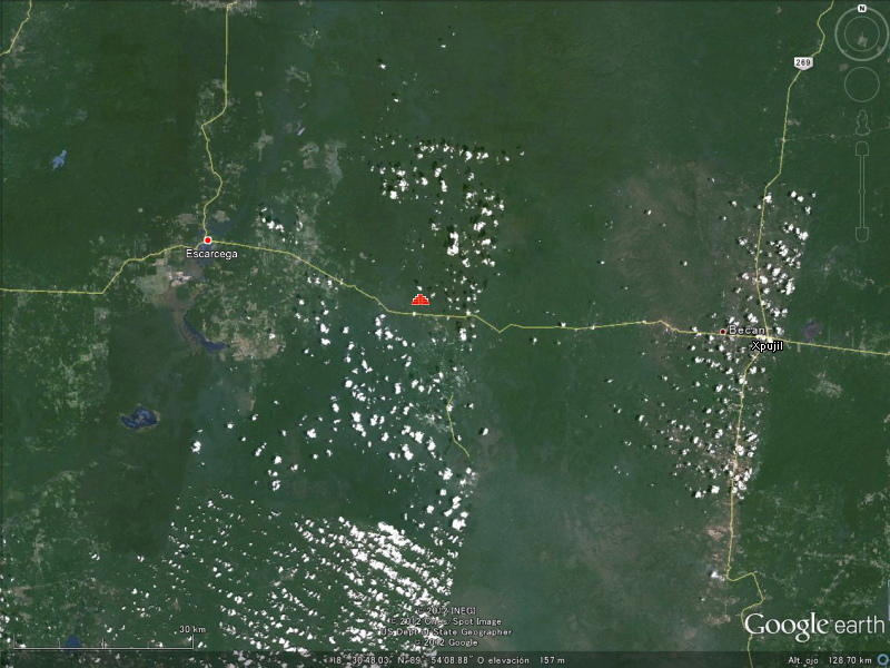 国道 186号線を エスカルセガから東へ 92Km、カラクムルへの分岐点手前に 遺跡の標識があり、左折して北西へ 3Km 入るとバラムク遺跡です。