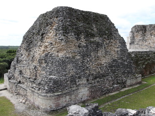 階段を上ると右側に建造物 IV の東側面が聳え、基部にはリオ・ベック様式の見せかけの階段が残されます。 左に見えているのは建造物 III