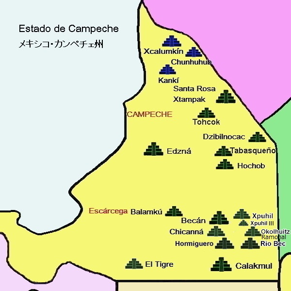 カンペチェ州はユカタン半島西側に位置し、北からプーク様式、チェネス様式、リオ・ベック様式、北部ペテン様式と、様々ななマヤ遺跡が見られます。 最南部のグアテマラ国境近くには古典期にティカルと覇を競った世界遺産のカラクムル遺跡もあります。