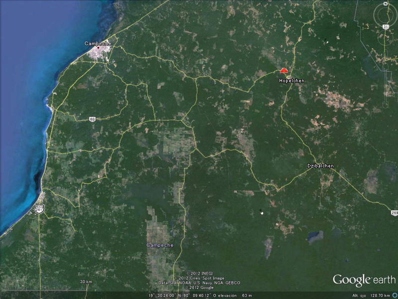 メリダからウシュマル、カバーを訪問してカンペチェに向かう場合は、ホペルチェンで西へ右折して国道 261号に入り 3 Km先が