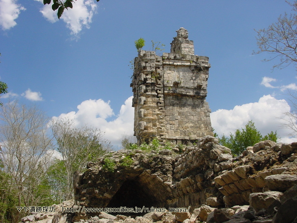 灌木の生い茂るジャングルの中に廃墟があり、塔がひとつ頭を覗かせます。 遺跡の事務所はなく INAH の職員も居ません。