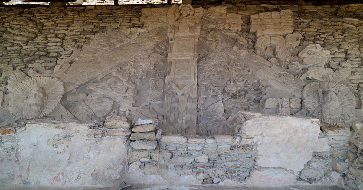 この建造物は蛍の家と呼ばれ、壁画にはバークナル・チャーク王の名前と 708年の年号があるそうで、丸い穴の向うには王の頭部彫刻が覗けます。