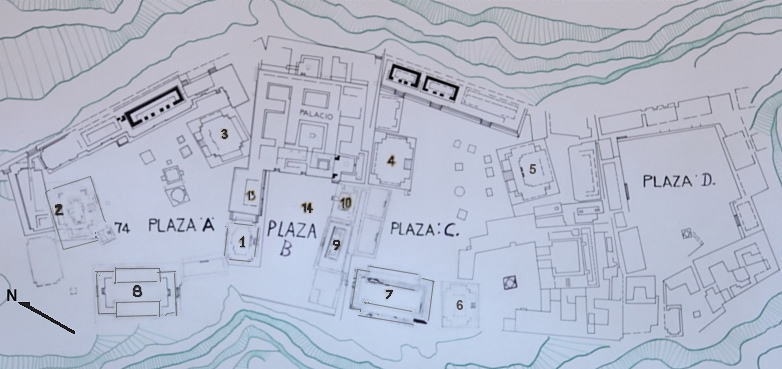 地図は博物館にあったパネルを撮ったもので、北西方向から遺跡へ入ると、広場 A から広場 D と続きます。 言うまでもありませんが、