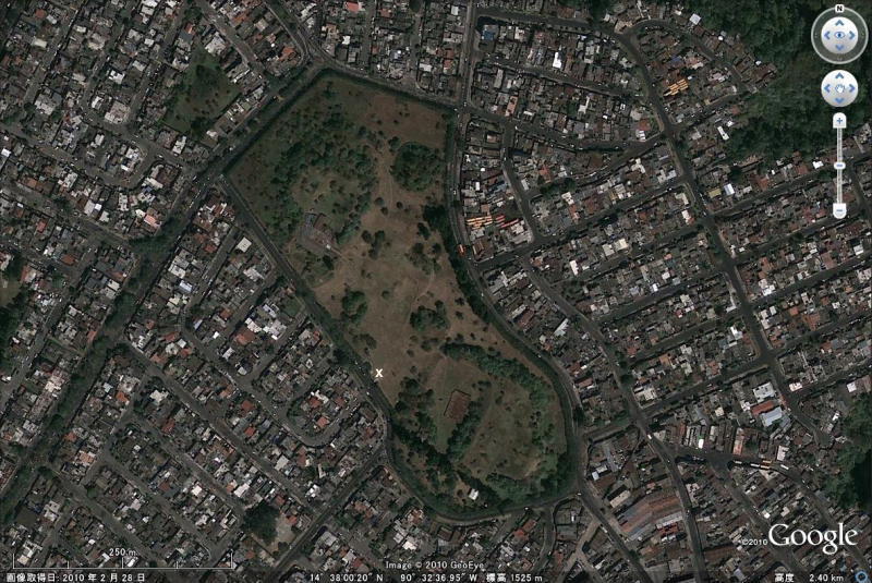 空から見た遺跡公園、小さな白い x 印が入口で、左手 北西方向の緑で囲まれた部分がアクロポリス、南東の外周道路に囲まれた