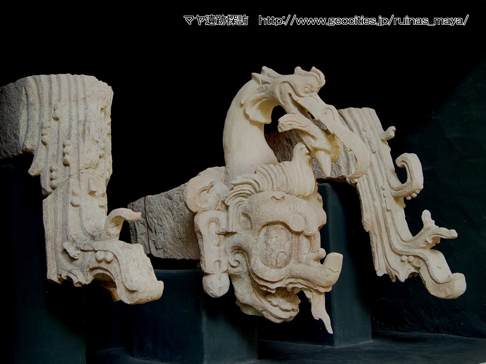 16号神殿の正面階段に置かれていた彫刻です。 3つ上下に並べられた一番上のもので、怪物の口の中は縛られた捕虜だそうです。