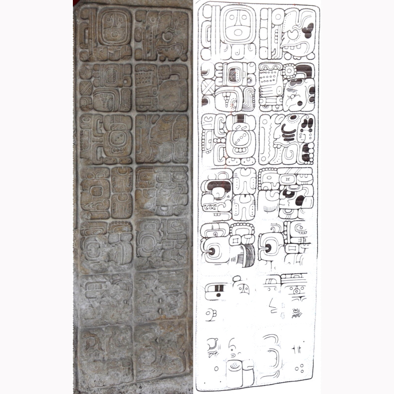 Ajaw 8 Xul (9.19.10.0.0 820AD)のカトゥンの切れ目を儀礼を執り行う王が彫られ、12 ウィナル後の 1 Ajaw 8 Kumk'u (9.19.10.12.0 820AD)