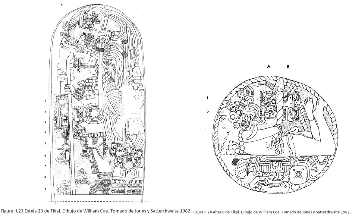 (Altar 8 y Estela 20 de Complejo de Pirámides Gemelas P, Tikal 751AD)