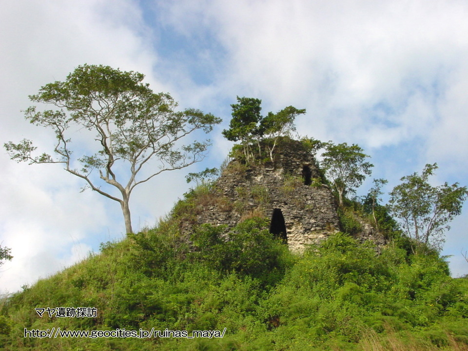 近づいてみました、やはりマヤの建造物です。 Nicolas Bravo II のようです。 それにしても草木が生い茂り荒れるがままです。