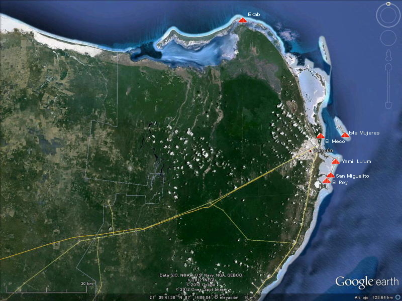 カンクンは I. CANCÚN と書かれ、島になっています。 現在は島の北も南も陸続きになっていますが、マヤの時代は
