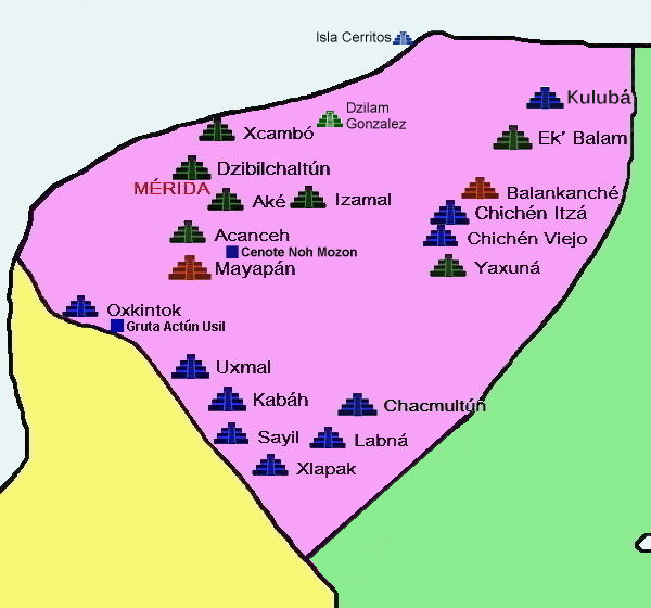 ユカタン半島北・中部を占め、半島の名前を冠したユカタン州には、古典期から後古典期にかけての有名なマヤ遺跡が数多く残されます。 先古典期からの遺跡もありますが、ユカタン州でマヤが最も隆盛を極めるのは古典期後期・終末期からで、プーク様式のウシュマル、そして チチェン イッツァが繁栄した後、後古典期にはマヤパンがマヤの中心センターになります。