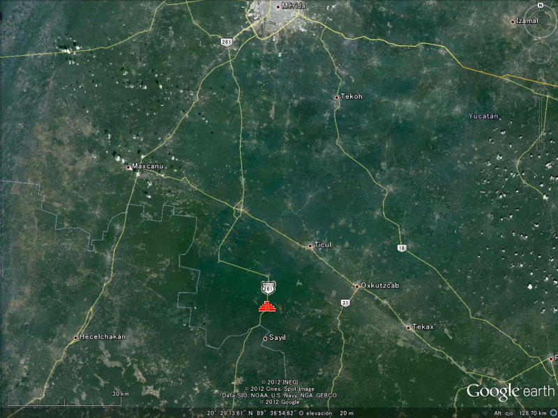未発掘の大ピラミッドで、国道の西側にあります。 ウシュマルの占い師のピラミッドのように基壇が楕円だそうです。