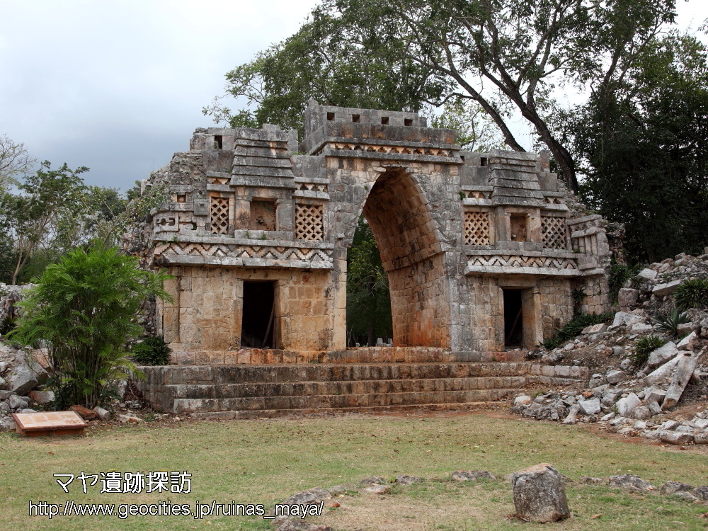 こちらがアーチの西面で、左側角にはチャーク像が配され、左右の部屋の上に、マヤ民家の彫刻があります。 もともと民家の窓部分には人物像が嵌め込まれ